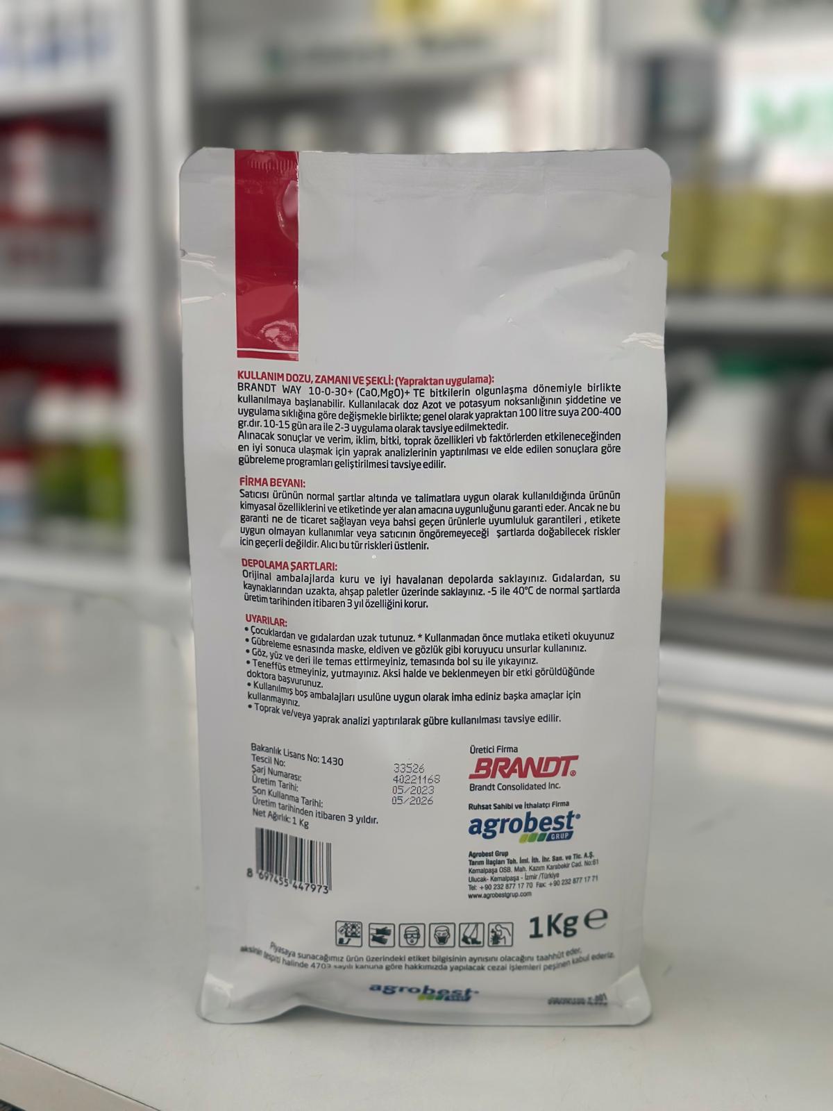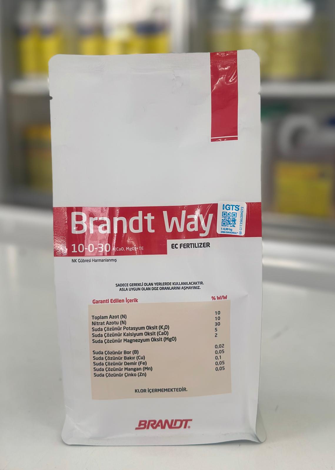 BRANDT WAY 10-0-30+TE bitkilerin erken gelişim dönemleriyle birlikte kullanılmaya başlanır. Alınacak sonuçlar ve verim, iklim, bitki, toprak özellikleri vb. faktörlerden etkileneceğinden en iyi sonuca ulaşmak için toprak ve yaprak analizlerinin yaptırılması ve elde edilen sonuçlara göre gübreleme programları geliştirilmesi tavsiye edilir. Kullanılacak doz, tarla bitkileri, sebzeler, meyve ağaçları, endüstri bitkileri, zeytin ve fındıkta genel olarak yapraktan 100 litre suya 200-300 gr’dır. 10-15 gün ara ile 2-3 uygulama olarak tavsiye edilmektedir.